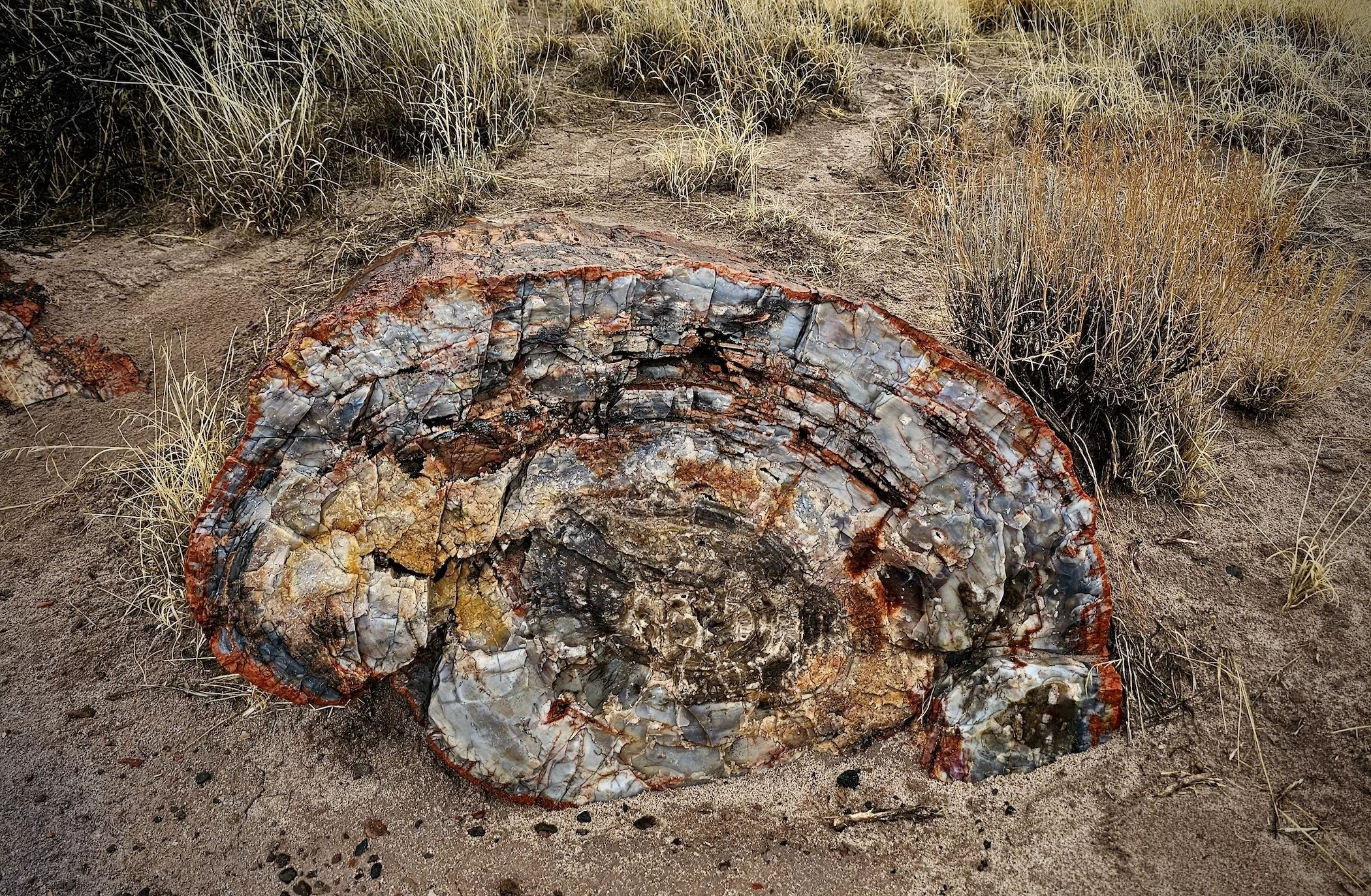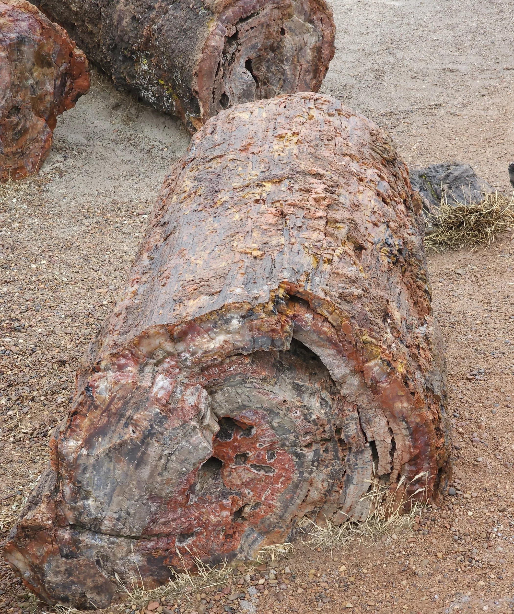 Petrified wood, which is a highlight of Petrified Forest National Park in the U.S., is a fascinating natural phenomenon. It forms when plant material, usually wood, is buried under sediment and protected from decay due to oxygen and organisms. Over time, the wood's organic materials gradually get replaced by minerals, most often silica (silicon dioxide) derived from volcanic ash or groundwater. This process, called permineralization, can take millions of years. During permineralization, the original structure of the wood, including its rings and grain, is meticulously preserved. The minerals crystallize within the cellular structure, turning the wood into a stone-like material while retaining much of its original appearance. As a result, petrified wood can vary in color due to the variety of minerals that may be present. Iron, carbon, and manganese contribute to a range of hues from black and brown to red, yellow, and green.