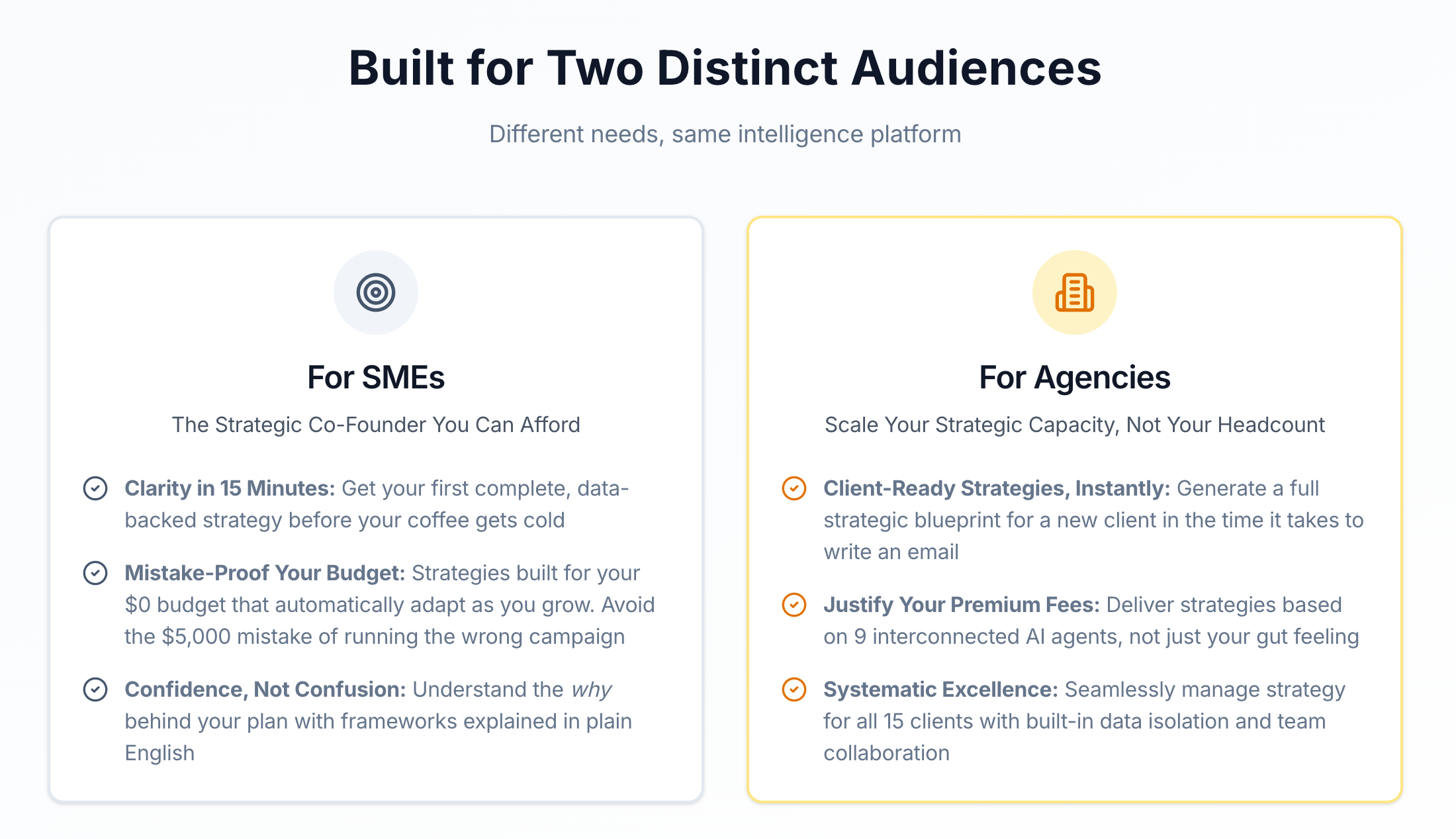The Strategy Agent’s Jobs-to-be-Done analysis revealed 14 places where we were selling the architecture instead of the benefit. Agency owners don’t hire STRAŦUM to get “data isolation”—they hire it to “scale strategic capacity without hiring another strategist.”