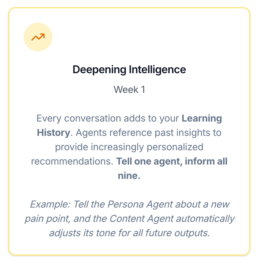 > “Week 1 revision: Add a concrete example. ‘Tell the Persona Agent about your target customer’s pain points, and the Content Agent automatically adjusts tone and messaging for all future outputs.'”